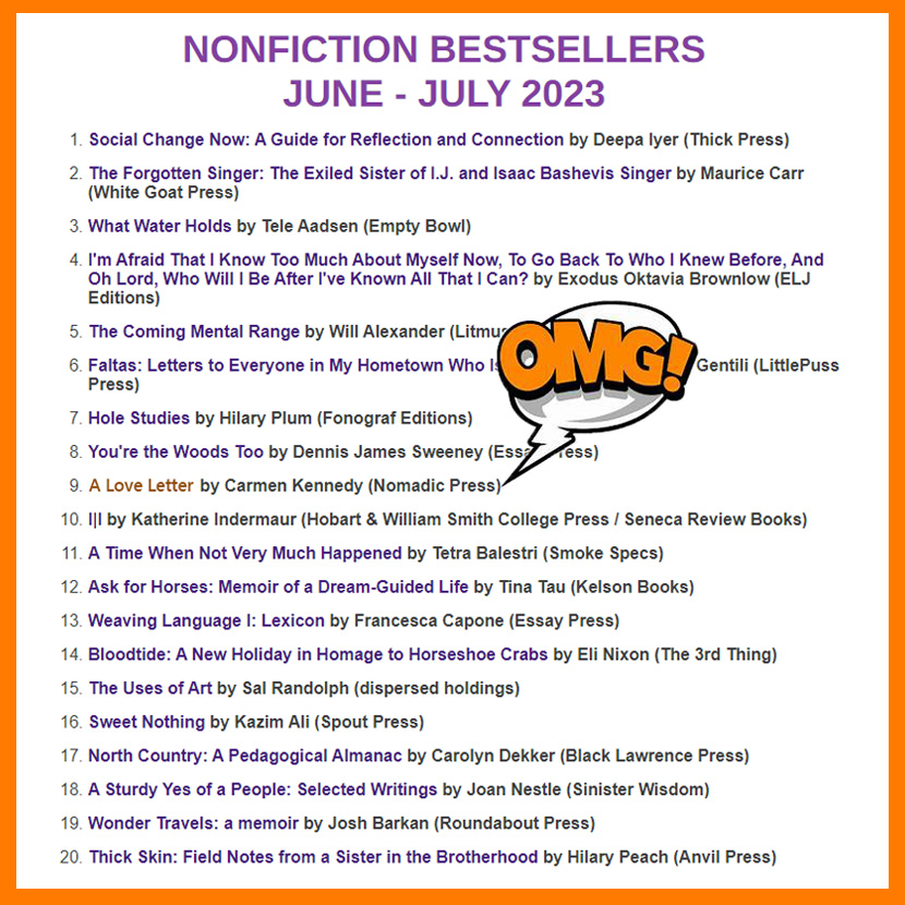 Whew! Small Distribution Press (SDP) listed A Love Letter in its correct genre: nonfiction. And its a consecutive bestseller, May through July. 👀